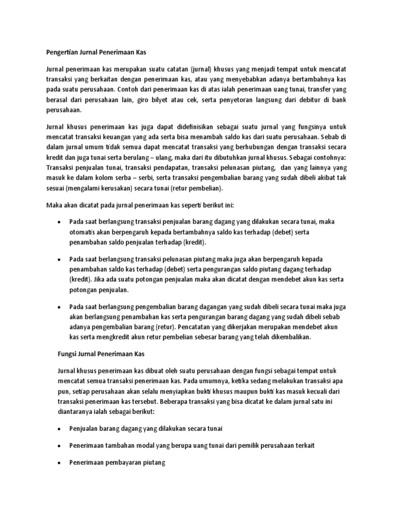 Pt sukses abadi adalah perusahaan dagang yang bergerak di bidang penjualan makanan dan minuman di dalam kaleng. Pengertian, cara pembuatan & contohnya. Pengertian jurnal penerimaan kas adalah catatan jurnal khusus sebagai tempat mencatat transaksi yang berhubungan dengan penerimaan kas atau …format 4. Pengertian kas kas adalah salah satu dari beberapa aktiva lancar. Jurnal penerimaan kas adalah jurnal khusus yang dipakai hanya untuk melakukan semua pencatatan transaksi yang berkaitan dengan penerimaan kas atau berbagai macam transaksi yang mempunyai dampak pada bertambahnya kas perusahaan.